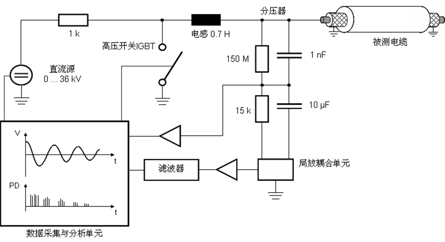 電纜纜振蕩波測試系統(tǒng)(OWTS,Oscillating Wave TestSystem)的測試原理是先對被測電纜加壓,之后在電纜中產(chǎn)生幾十到幾百赫茲頻率的阻尼振蕩電壓(接近于電纜的工頻實際運行狀態(tài)),使電纜絕緣薄弱處產(chǎn)生局放,最終根據(jù)接收到局放脈沖的信號對電纜進(jìn)行局放水平計算并定位。由于振蕩測試過程時間極短,僅約為幾百毫秒,對電纜的損害幾乎可以忽略不計;諧振電壓頻率接近工頻,試驗情況與電纜實際運行情況十分接近;不僅能夠測量電纜內(nèi)部缺陷的嚴(yán)重程度,更能對缺陷進(jìn)行定位;體積小、便于攜帶。OWTS系統(tǒng)擁有的這些優(yōu)良特征,使它成為電纜絕緣的主要檢查方式。可廣泛地應(yīng)用于電力電纜的交接試驗、預(yù)防性試驗以及運行電纜的狀態(tài)診斷,達(dá)到提高電纜運行的安全可靠性的目的。