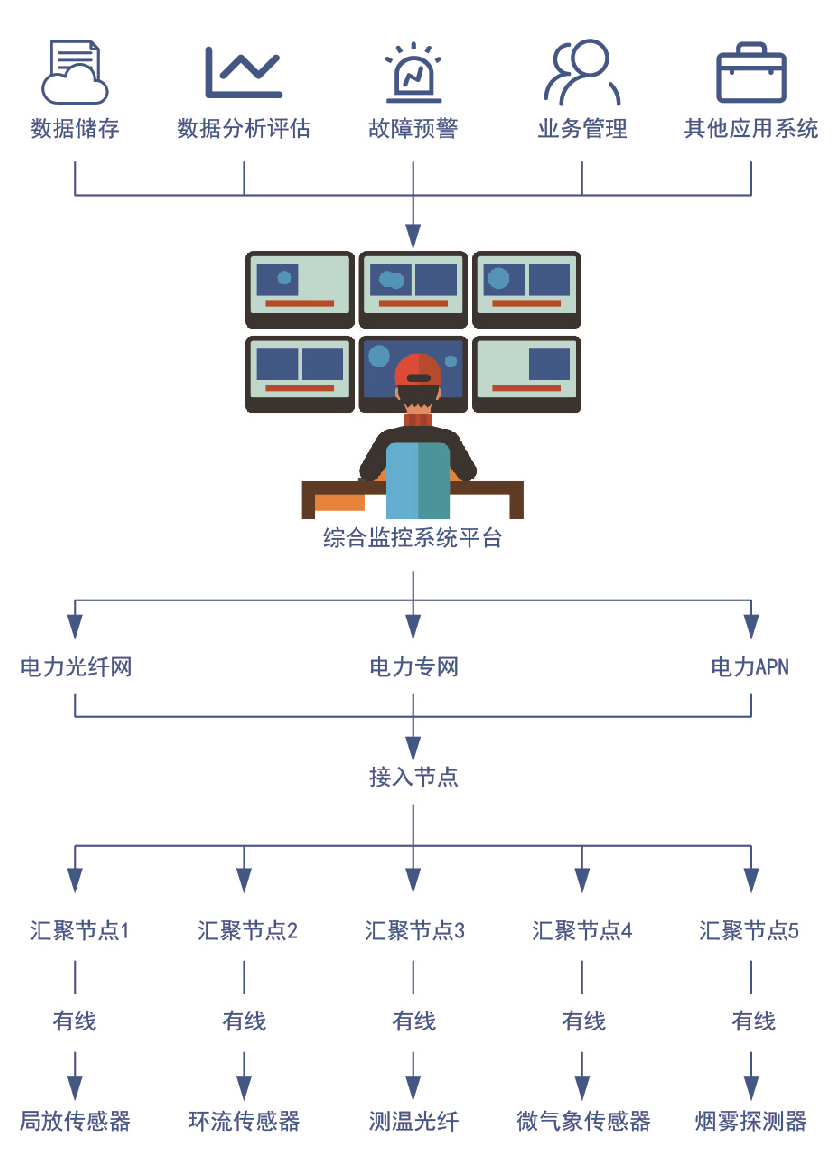 該方案以局放、環(huán)流、溫度為基本監(jiān)測手段,并融合氣象、水溫、煙霧等環(huán)境監(jiān)測,在感知層充分采集電纜運行狀態(tài)信息,在網(wǎng)絡(luò)層,結(jié)合無線、有線、光纖等通信方式,將數(shù)據(jù)接入電力系統(tǒng)專網(wǎng),與電力系統(tǒng)綜合平臺進行無縫對接。我公司研制的綜合監(jiān)測系統(tǒng)平臺,可實現(xiàn)對多種傳感器信息的數(shù)據(jù)接收、存儲、綜合分析評估,并結(jié)合大數(shù)據(jù)、云計算、人工智能等先進技術(shù),在平臺層實現(xiàn)了數(shù)據(jù)的綜合處理,并為應(yīng)用層的智能管控提供參考依據(jù)。